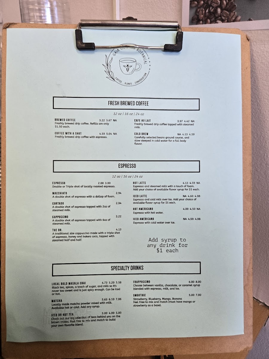Gaia Cafe and Botanical offers a thoughtfully curated menu that blends simple café favorites with comforting, plant-inspired touches. From their selection of freshly baked muffins—like Blueberry Crumble and Triple Chocolate—to carefully crafted espresso drinks such as cappuccinos and cortados, the menu invites guests to savor familiar flavors in a calm, welcoming space.